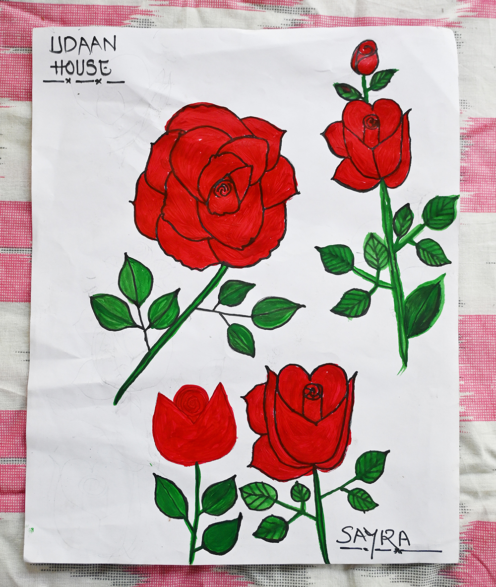 Como puedes comprobar, Sayra tiene dotes para la pintura y es muy creativa. Le gusta expresarse a través del dibujo y el arte. En nuestra Casa Udaan está teniendo la oportunidad que hasta ahora no ha tenido en la vida: curar sus heridas, dejar atrás el pasado, y buscar un futuro mejor para ella y su hijo.