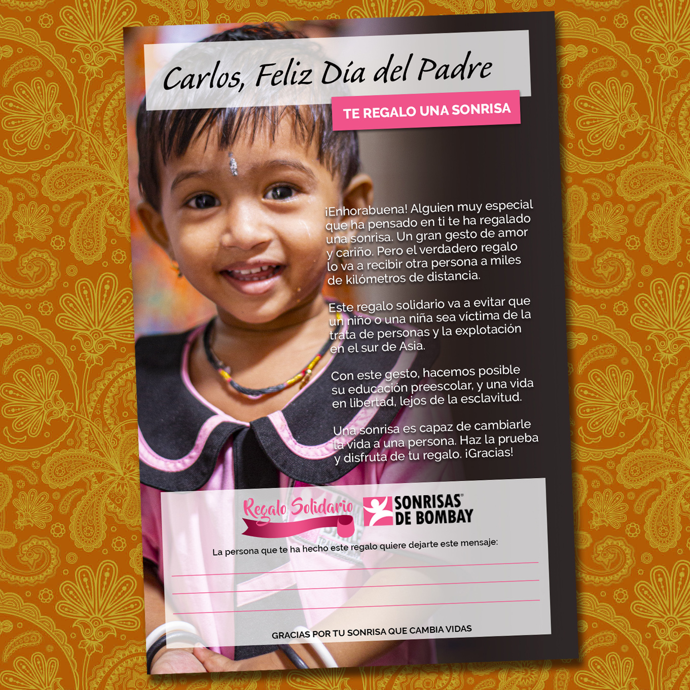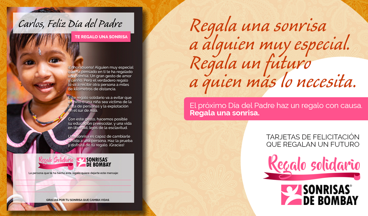Con esta tarjeta por 15 euros, tu gesto va a servir para evitar que un niño o una niña en edad preescolar sea víctima de la trata de personas y la explotación en el sur de Asia. Con este regalo hacemos posible su educación preescolar, y una vida en libertad, lejos de la esclavitud.